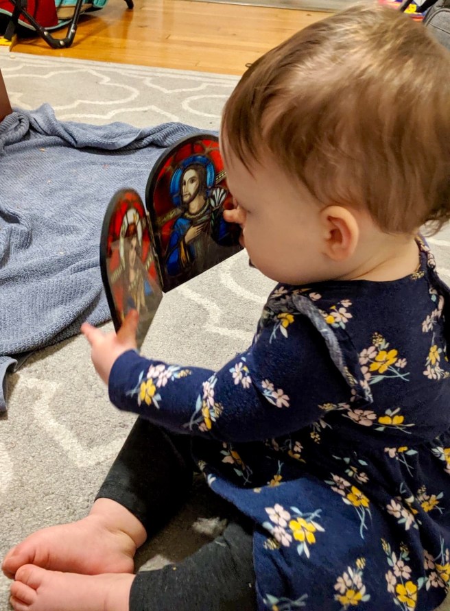 Two separate items. The first, a small diptych portraying replicas of a stained glass window of Joseph and Mary in one of the hall chapels at the University of Notre Dame. This sits, perched high on our windowsill in the dining room, and Anne loves it beyond all things. If we ask her, “where are Joseph and Mary?” she quickly, insistently, confidently points, “eh!!! eh!!!” and more often than not, she demands with further gesticulations that it be brought down for her inspection.